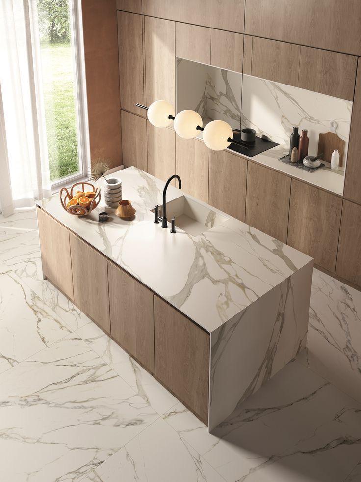 • کابینت طرح چوب → سرامیک با رگه‌های ملایم سنگی